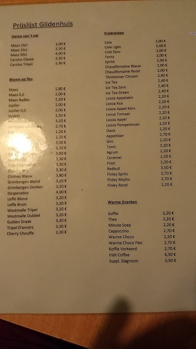The menu at Gildenhuis (Taverne) primarily features a selection of beverages with a focus on pils, a type of Belgian beer. As a café, the offering is centered around drinks suitable for casual consumption, including a variety of beers and likely coffee options, though specific food items are not detailed.